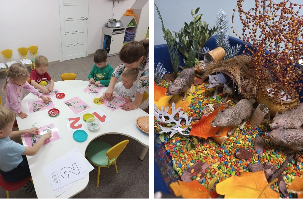 Задания и обучающие игры разделены друг между другом логоритмическими паузами, во время которых ребята не только отдыхают, но и развивают крупную моторику.