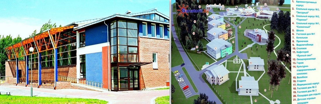 На территории Центра находятся несколько корпусов, расположенных недалеко друг от друга, оборудованные площадки для игры и отдыха детей, большой досуговый центр, столовая и оздоровительный блок. Имеется свой выход к Вилейскому водохранилищу с возможностью организации барбекю. Территория огорожена и круглосуточно охраняется